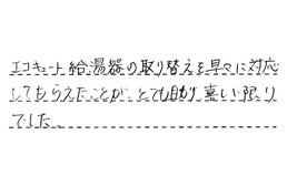 エコキュート給湯器の取り替えを早々に対応してもらえたことが、とても助かり、嬉しい限りでした。