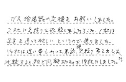 ガス給湯器の交換をお願いしました。2社に見積りを依頼しましたところ、1社は写真を送って欲しいというので、送りました。御社は近い事もあって、来訪、即見積り書を出しました。比較すると、殆ど同額だったので、御社にしました。