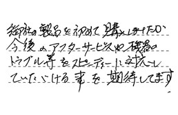 御社の製品を初めて購入しましたが、今後のアフターサービスや機器のトラブル等を、スピーディーに対応していただける事を期待してます。
