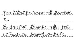 すぐに対応して下さったことが、一番ありがたかった。若い方でしたが、感じがよく、丁寧に対応して下さいました。ありがとうございました。