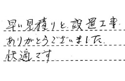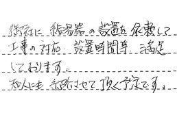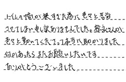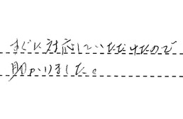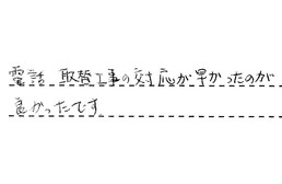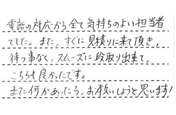 電話の対応から、全て気持ちのよい担当者でした。また、すぐに見積りに来て頂き、待つ事なく、スムーズに段取り出来て、こちらも良かったです。また何かあったら、お願いしようと思います。