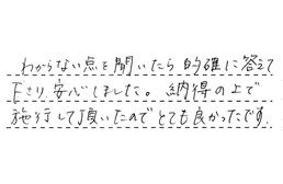 わからない点を聞いたら、的確に答えて下さり、安心しました。納得の上で施工して頂いたので、とても良かったです。