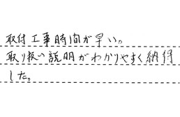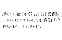 注文から取付け完了まで、とても短期間にスムーズにやっていただき、満足しました。ありがとうございました。