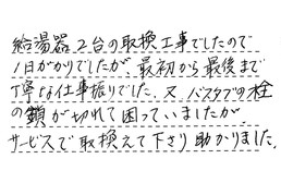 給湯器2台の取換工事でしたので、1日がかりでしたが、最初から最後まで、丁寧な仕事振りでした。又、バスタブの栓の鎖が切れて困っていましたが、サービスで取換えて下さり、助かりました。