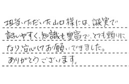 担当いただいた山口様には、誠実で話しやすく、知識も豊富で、とても頼りになり、安心してお願いできました。ありがとうございます。