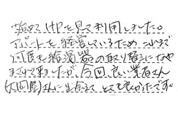 相談があり電話すると、すぐ対応してくれ、とても好感がもて、安心してお願い出来ました。知人に告示をしたいと言う方がいたら、紹介しても大丈夫だなぁ、と思っています。ありがとうございました。