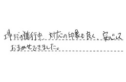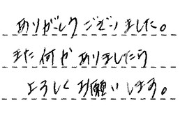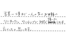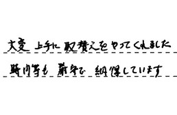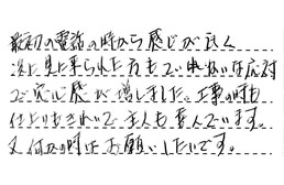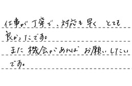 最初の電話の時から、感じが良く、見に来られた方もていねいな応対で、安心感が増しました。工事の時も仕上りもきれいで、主人も喜んでいます。又、何かの時は、お願いしたいです。