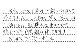 寒い中、長時間工事をして下さり、ありがとうございました。丁寧にやって頂き、満足しています。