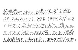 給湯器がこわれ、お湯も使えず、お風呂にも入れないところ、とてもはやく対応してくださって、ありがとうございました。職人さんもやさしく、対応もよかったです。その上、価格もお値うちで、たすかりました。ありがとうございました。