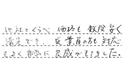 他社とくらべ、価格も数段安く満足でき、従業員の方の対応もよく、非常に良感がもてました。
