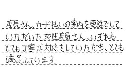店長さん、カード払いの案内を電話でしていただいた女性店員さん、いずれもとても丁寧な対応をしていただき、とても満足しています。