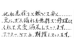 他社見積りと較べて安く、更に、ガス漏れも無料で修理してくれて、大変満足しています。アフターケアも期待しています。