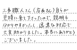 工事職人さん(店長さん)自らが見積に来て下さったので、説明も分かりやすかったし、迅速な対応で、大変助かりました。本当にありがとうございました。