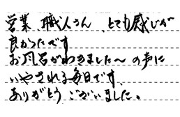 営業、職人さん、とても感じが良かったです。お風呂がわきました~の声に、いやされる毎日です。ありがとうございました。