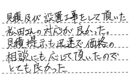 見積及び設置工事をして頂いた松田さんの対応が良かった。見積提示も迅速で、価格の相談にも応じて頂いたので、とても良かった。