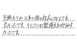 見積もりや工事の時の対応は、とても良かったです。リモコンの説明もわかりやすかったです。