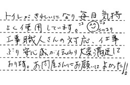 トイレがきれいになり、毎日気持よく使用しています。工事職人さんの対応、仕事ぶり、安心感が伝わり、大変満足しております。大問屋さんにお願いしてよかった!!