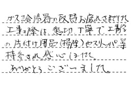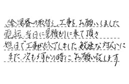ガス給湯器の取替お疲れさまでした。工事の際は懇切丁寧で、工事後の片付け用品(掃除)やスリッパ等持参され、感心しました。ありがとうございました。