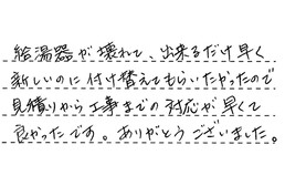 給湯器の取替え、工事をお願いしました。電話当日に見積もりに来て頂き、短日で工事が終了しました。敏速な対応に、また次も何かの時に、お願い致します。