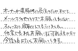 オーナーが遠隔地に居住のため、すべてメールでのやりとりでお願いしましたが、スムースに段取りしてもらいました。他室でも、またお願いする可能性があり、今後ともよろしくお願いします。