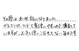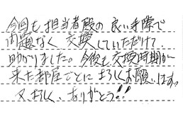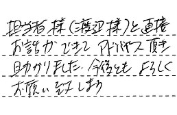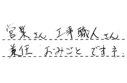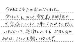今回は大変お世話になりました。受付の方をはじめ、営業兼工事担当者も大変感じがよく、工事もてきぱきと行っていただいて、感謝しています。次回も何かあれば、よろしくお願い致します。