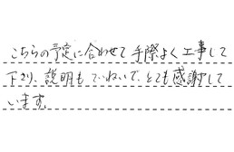 こちらの予定に合わせて、手際よく工事して下さり、説明も丁寧で、とても感謝しています。