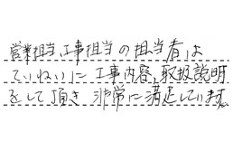 営業担当、工事担当の担当者は、ていねいに工事内容、取扱説明をして頂き、非常に満足しています。