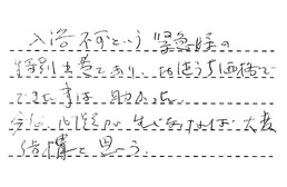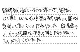 営業時間を過ぎているにも関わらず、電話に出て頂き、しかもその後、夜の9時以降にも関わらず、訪問して頂き、とてもたすかりました。給湯器のメーカーも的確な指示を頂き、たすかりました。ありがとうございました。