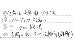 1. 他社を凌駕するプライス 2. スピーディな対応 3. 分りやすい説明 4. 長期に渡るサービス特権(保証)
