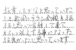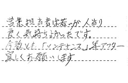 営業担当者は若いが人当り良く、気持ちよかったです。今後とも「メンテナンス」等、アフター宜しくお願いします。