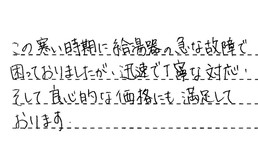 この寒い時期に給湯器の急な故障で困っておりましたが、迅速で丁寧な対応、そして良心的な価格にも満足しております。