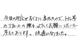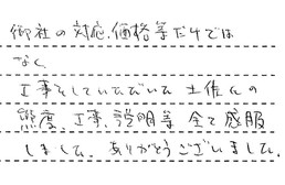 御社の対応、価格等だけではなく、工事をしていただいた土佐くんの態度、工事、説明等、全て感服しました。ありがとうございました。