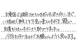 お電話で相談させていただいた次の日に、すぐに現地(自宅)を下見に来ていただき、早急に見積もりもいただけて、助かりました。今後も何かあれば、お願いしようと思います。