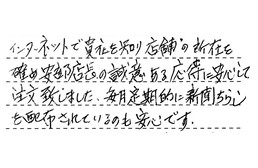 インターネットで貴社を知り、店舗の所在を確かめ、安部店長の誠意ある応対に安心して注文致しました。毎月定期的に新聞ちらしを配布されているのも安心です。
