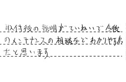 取付後の説明がていねいで、今後のメンテナンスの相談など、わかりやすかったと思います。