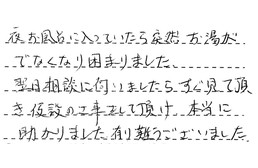 夜お風呂に入っていたら、突然お湯がでなくなり、困りました。翌日相談に伺いましたら、すぐ見て頂き、仮設の工事をして頂け、本当に助かりました。有り難うございました。