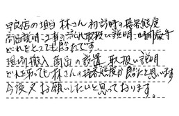 早良店の担当林さん、初訪問時の接客態度、商品説明、工事の流れ、取扱い説明、時間厳守、どれをとっても良かったです。現場搬入商品の設置、取扱い説明、どれを取っても、林さんの接客態度が良かったと思います。今度又お願いしたいと思っております。