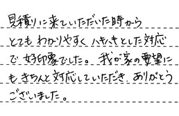見積りに来ていただいた時から、とてもわかりやすく、ハキハキとした対応で、好印象でした。我が家の要望にもきちんと対応していただき、ありがとうございました。