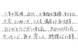 工事の説明、進行、工事後の清掃、すべてに大変ていねいで、とても満足しております。ありがとうございました。きれいになったキッチンで、毎日楽しく料理しています。