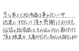 急な寒さで給湯器工事の忙しい中、迅速に対応して頂き、感謝しております。仮設の給湯器を、その日のうちに取付けて頂き、娘達も大喜びでした。知人にも紹介します!