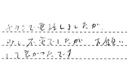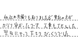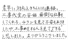 素早い対応と、きちんとした連絡。工事代金の安価、面倒な仕事もしてくれる。チラシを見て不安もありましたが、工事をする人を見て、「できる」と思いました。ありがとうございました。