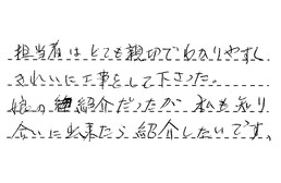 担当者はとても親切で、わかりやすく、きれいに工事をして下さった。娘の紹介だったが、私も知り合いに、出来たら紹介したいです。