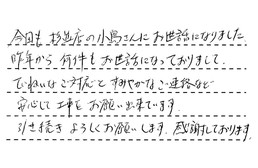 今回も杉並店の小島さんにお世話になりました。昨年から何件もお世話になっておりまして、ていねいなご対応とすみやかなご連絡など、安心して工事をお願い出来ています。引き続きよろしくお願いします。感謝しております。