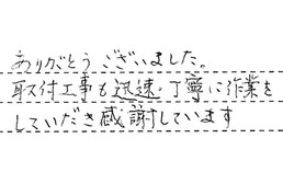 ありがとうございました。取付工事も迅速・丁寧に作業をしていただき、感謝しています。