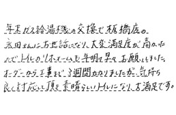 吉田さん担当で、見積りから設置まで、ていねいにご対応頂き、ありがとうございました。あたたかいお風呂に入浴出来るようになり、大満足です。