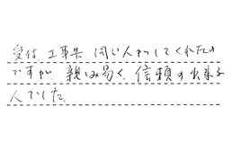 受付、工事共、同じ人がしてくれたのですが、親しみ易く、信頼の出来る人でした。