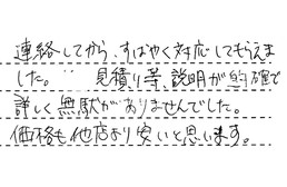 連絡してから、すばやく対応してもらえました。見積り等、説明が的確で、詳しく無駄がありませんでした。価格も他店より安いと思います。