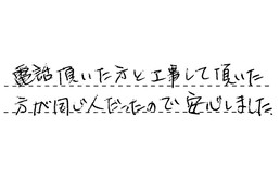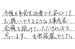 今後も年金生活者でも安心してお願いできるような工事内容・金額を続けていただければと思います。お世話様でした。