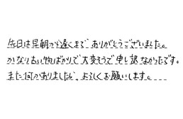 先日は早朝から遅くまで、ありがとうございました。かなり古い物ばかりで、大変そうで、申し訳なかったです。また何かありましたら、よろしくお願いします。