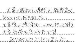 工事の段取り・進行を、効率良くやっていただきました。工事後の清掃もしっかり行って頂き、大変気持ち良かったです。ありがとうございました。